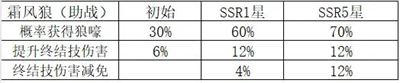 霜风狼主战时,可以提高终结技异常状态命中概率,回合结束清除全体异常状态。SSR进化后,额外增加了异常状态抗性,异常状态命中提升与清除异常状态概率不会再增加,对敌方全体造成伤害提升也小,星辰建议升级到SSR1星停止。