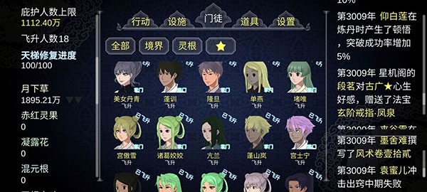 6、弟子特性优先远八面玲珑的,不会结仇导致随时被暗算找茬,后期人多了修装备很烦,或者直接修不过来,中后期能不选拔弟子就不要选拔了,挑一些带回来的弟子,有20%修炼加成。