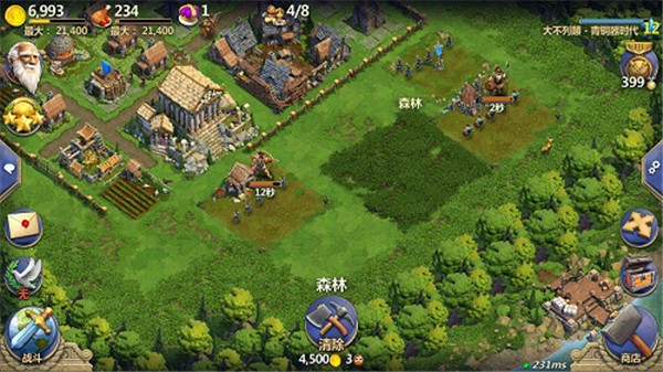 1、在时代发展过程中,玩家可进行领土扩张,也就是砍伐森林扩大领地,每次扩大领地都能够发现更多未被探索的资源:宝箱、长颈瓶、金矿、遗迹等,还会出现佣兵营地,和一些石堆树林