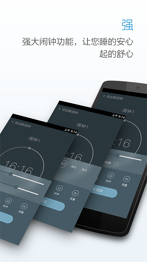 1、精致的世界时钟:内置算法不需联网也可告诉您世界各地时间,是您至各国出差旅游的工具。 2、实用的计时器:内置跑步、午睡、面膜、煲汤等常用计时,并支持自定义添加新的常用计时,帮您锁定一切重要时刻,妈妈再也不用担心煲汤过了火,面膜做了太久,午睡过了头。 计时开始后,即时程式被关闭都可以继续计时。 3、便捷的秒表:提供最简单、实用的秒表。给您iphone式体验。 4、专注闹钟功能,不花哨,让闹钟设置简单、易用、实用,减少内存占用。 5、自定义设置,满足您的喜好:闹钟重复周期和贪睡模式设置,让您不会由于想赖床而错过上班时间;铃声和音量的自定义,让您在每一个早晨伴着喜爱的音乐醒来,带来愉悦的心情。 6、智能化的闹铃激活算法:如果您正在通电话,闹铃会自动静音,以便不打扰您。当闹铃运行时正好有人给您打电话,它将会自动静音,并开始播放电话铃声。软件特色
