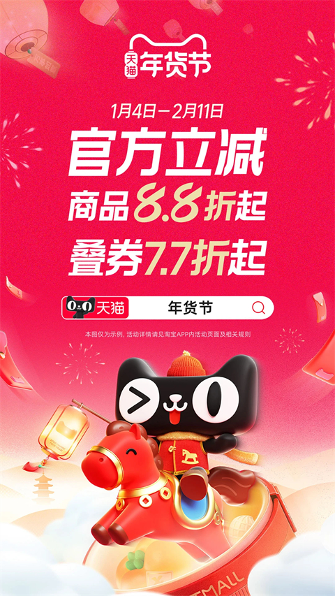 天猫年货狂欢季来了,官方立减商品8.8折起,叠券7.7折起! 最高领8.8折消费券,好货折上折 万券可叠购物金,限时膨胀5折起 直播红包,抢30亿预售红包 天猫惊喜盒,0.01元赢千元独家礼 百亿补贴,真补贴,真优惠