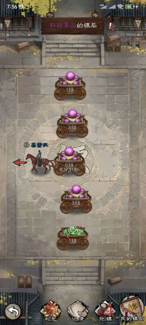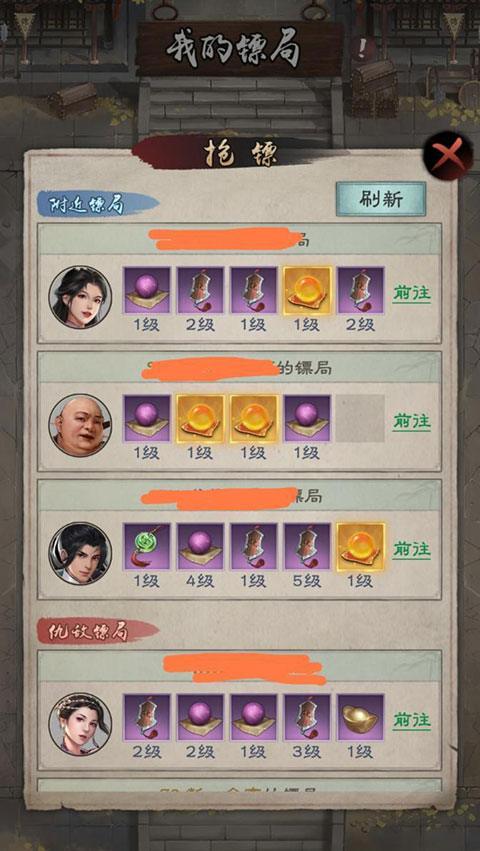 5、接下来就是本游戏的最核心玩法之一,押镖,江湖人称——偷菜,新区可以先拉自己最紧需的资源,比如天赋升级的突破丹,增加上阵的名望帖,5级以上的元宝。