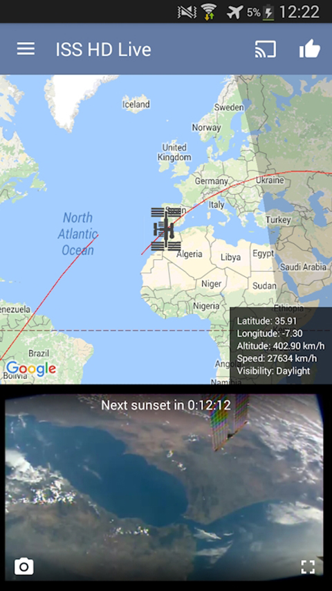 1、国际空间站高清实况将直接在你的安卓手机或平板电脑上向你展示来自国际空间站的地球实况视频资讯。 2、国际空间站高清实况为你提供令人兴奋的体验,一切都经过周到考虑和设计,完整的应用程序显示其上方约400公里的地球视频流,许多选项可完全自定义。 3、你可以在你的设备屏幕获取由国际空间站相机直接提供的震撼实况高清视频流。 4、该应用程序集成了原生安卓谷歌地图(国际空间站跟踪器),你可以在其中跟踪我们星球上的国际空间站轨道,缩放、旋转、拖动、倾斜地图。 5、你可以选择不同类型的地图,例如卫星或地形,还会显示信息窗口,其中包括国际空间站速度、高度、能见度、空间站当前经过的国家/地区、纬度和经度等数据。一切都可以从设置菜单中自定义。注意事项