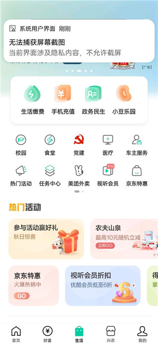 4、点击生活,这里支持生活缴费、手机充值等等;