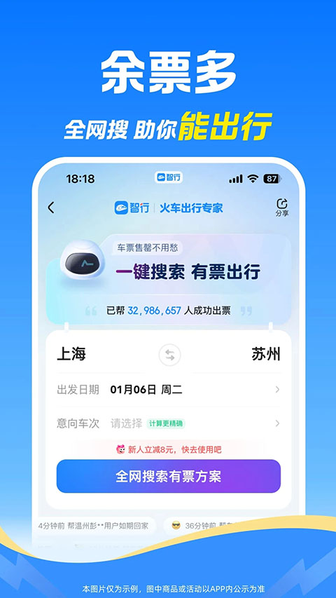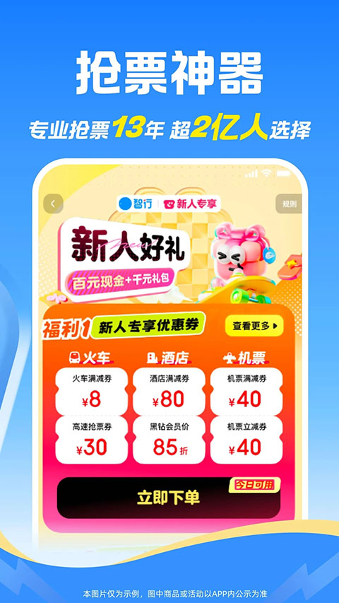 【春运抢票】智行抢票黑科技全新升级,抢先预约,出票更快!24小时余票检测,有票自动抢!云端多线程,双通道抢票,出票率更高~ 【智行火车】支持官网出票,候补管家+余票挖掘+放票预测,助你轻松出行! 【智行酒店】春节订低价酒店,福利加「马」,玩法多多,参与集卡省翻天! 【智行会员】全新上线会员中心,月月可领大额火机酒优惠券~
