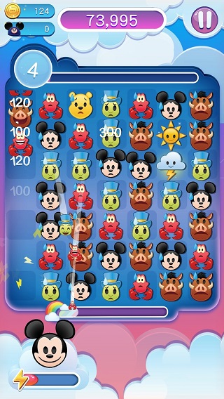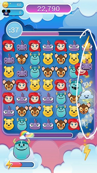 2、游戏开始后跟其他游戏一样滑动三个表情一样即可消分。不过四个可以产生带闪电的云它会消除一行。