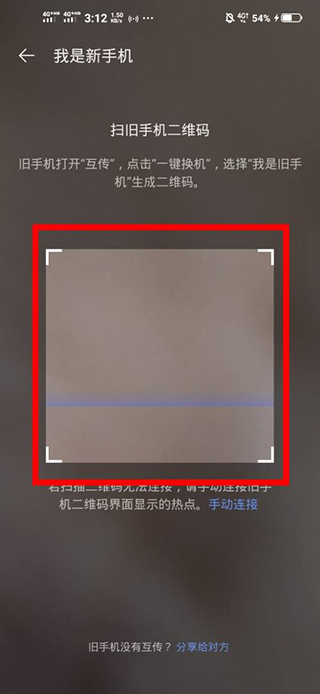 10、屏幕上会出现一个扫描框,将手机的摄像头对准上面旧手机屏幕上的二维码进行扫描,旧手机上面的数据就会一键转移到新手机。