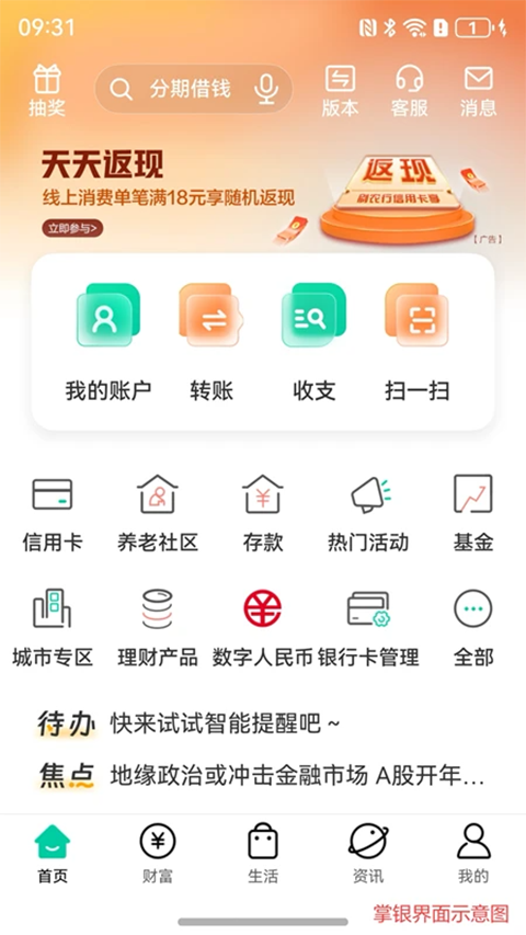1、农行掌上银行,您的线上智慧“新银行”!掌银新版本功能更强大,服务更贴心,让每个用户都拥有专属的“线上网点”。 2、乡村版充值专区、专属理财保险、特色涉农产品,贴近县域乡村用户的日常需求,惠民利民。 3、大字版提供超大字体“一大到底”,精选产品,功能简洁,无弹屏广告,为高龄人士提供清爽体验。 4、标准版主要功能新增支持提供语音播报等无障碍服务,为特殊客群提供贴心关怀。 5、全面收支展示分析,“钱从哪来,花在哪里”一目了然。设置预算提醒,超出预算小信封自动提醒。 6、搜索功能方便易用,支持语音交互。搜索覆盖范围更广、结果准确度更高、推荐内容更智能。 7、线上反欺诈利用大数据、人工智能等前沿技术有效识别线上高风险交易,保障客户资金安全。 8、做任务赢好礼、秒杀抢购、支付优惠,热门活动精彩来袭!每日签到得小豆,可兑换各类好物,新客更有三重礼,畅享优惠福利多。软件特色
