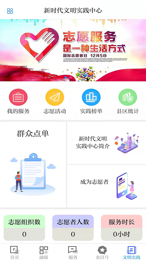 成为一名光荣的志愿者,为金昌市建设出自己的一份力,是一件伟大的事情,接下来就让我们一起来看看,如何通过镍都金昌App申请成为志愿者吧。 1、在本站下载安装好镍都金昌官方版应用后,打开应用,点击右下角“文明实践”。
