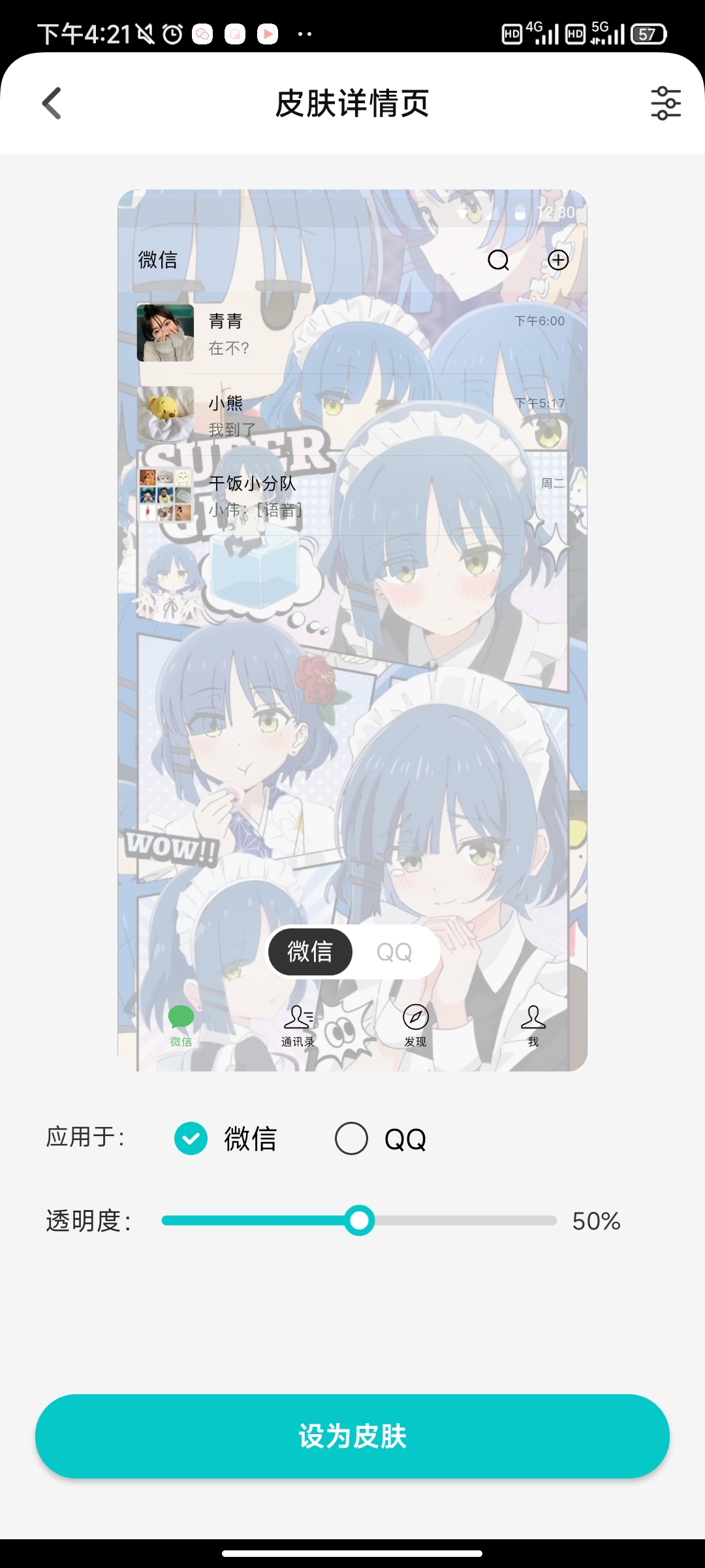 3、在皮肤详情页内将应用于微信选项勾选,以及调整透明度后点击设为皮肤就可以了,记得开启所需要的权限。
