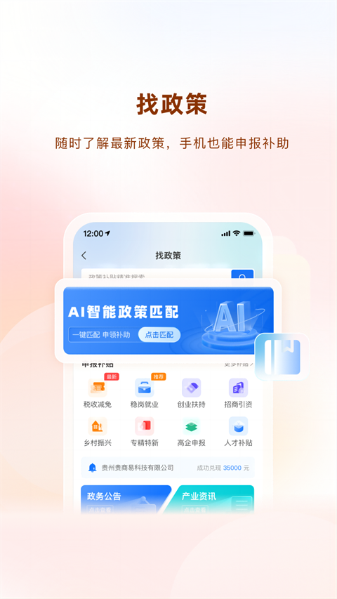 1、政策法规公布,权威人士解读,信息推送。 2、企业问题投诉,政府积极响应,受理督办协同。 3、办事指南梳理,让“信息多跑路、群众少跑路”。 4、民企资讯发布,企业全方位了解市场动态。 5、红榜名单、黑榜名单、联合惩戒、失信被执行人等政府数据公示,统一提供查询和验证服务。 6、金融产品支撑,提供在线信贷金融服务。功能介绍