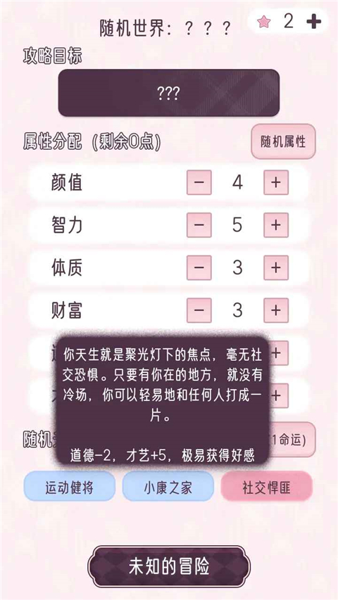 3、开始分配你的属性点数,以及随机天赋。你也能给攻略目标换个名字,所有都准备好后就能开启人生了!