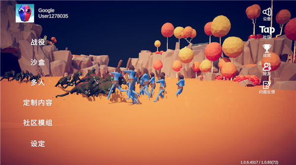 1、【史诗级的战役演出】 在战役模式中,巧妙利用地图地形和兵种阵容,制定花式布兵打法投入战场。由于“超现实”的物理引擎效果,战斗中将会迸发许多意料之外的状况;拉进镜头,切换子弹时间,好戏才刚刚上演! 2、【100+天马行空的兵种】 游戏提供百余种性能(性格)各不相同的兵种,来自各个派系、时代文明和神话传说。从发射尖刺的仙人掌到召唤分身耍棍的孙悟空,这些“训练有素”的战士能够对战局起到蝴蝶效应般的影响。 3、【自定义沙盒,兵种DIY】 不满足于挑战既定的战役?玩转沙盒模式,自由切换地图,自定义战局和对战阵容,随意拿捏自己想要的兵种属性、服装,和武器技能,打造独一无二的奇迹憨憨军团演绎精彩战斗。 4、【支持联机】 手机版加入联机对战模式和房间大厅;随机匹配,或是邀请好友切磋,支持安卓和iOS玩家互相对决!更新日志