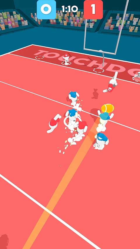 1、清新自然的游戏界面给你视觉上的享受; 2、利用自己敏捷的走位来躲避对方的攻击,抢夺橄榄球; 3、与自己的队友配合好,在规定时间内拉大比分差距。游戏玩法