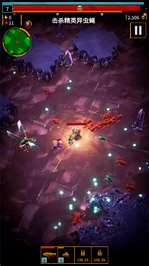 3、遇见虫子武器会自动射击,玩家只需要控制方向并拾取经验即可。
