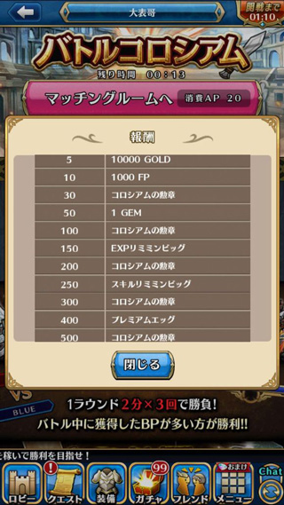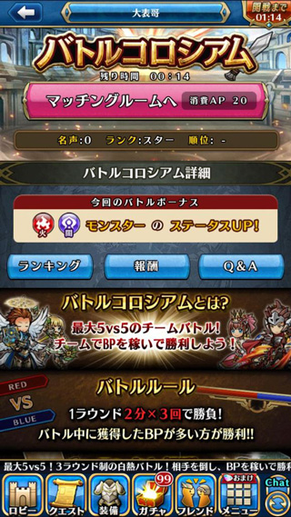 系统随机将10名玩家分配5V5的组进行战斗。100级以上为star组。100级以下每10级为一个分组(类似WOW的战场机制),star组如下图,每次参战消耗20AP。点击中央粉色按钮即可参战。