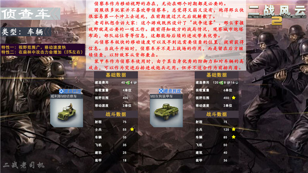1、侦察车在前期的作用比较大,开视野,打步兵,打建筑,就没有侦查车干不了的事,除了占领建筑外几乎全包了,可以说是名副其实的劳工,直到轻坦出现。