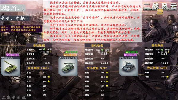 2、炮兵和步兵一样,防御力极低,反坦克炮防御为0,后两者也只有50,如果被敌方突击后排就不要想着跑了,硬刚到最后吧!
