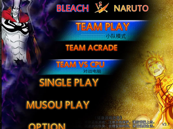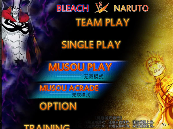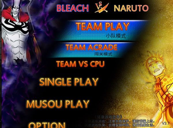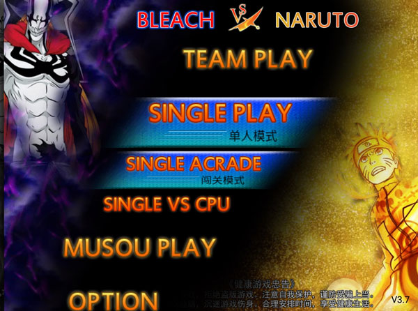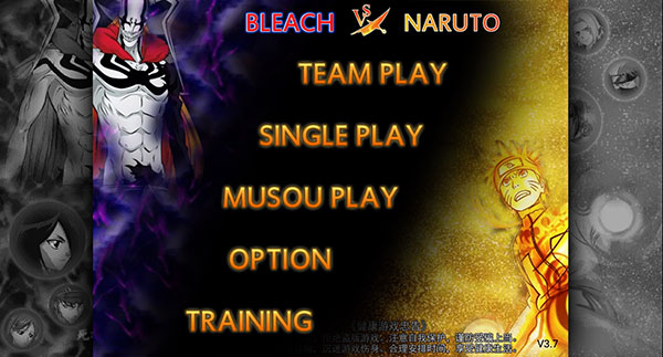 一、新手指引 1、打开死神vs火影,进入选择玩法模式,小队模式TEAM PLAY、单人模式SINGLE PLAY、无双模式MUSOU PLAY。