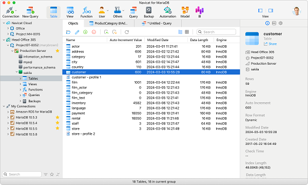 Navicat for MariaDB Mac版是一款专门为MariaDB数据库管理和开发提供原生环境的软件,能连接本地或远程的 MariaDB 服务器,并与 Amazon RDS 兼容。Navicat for MariaDB支持大部份附加的功能,例如新的存储引擎、微秒、虚拟列等。无论是在保存数据方便还是管理企业数据方面,软件提供的能力都是非常强大的,适合大型企业处理本公司的日常运营数。Navicat for MariaDB Mac版是数据库程序中比较先进的管理程序,针对企业用户提供了专家级别的管理模式,有需要的用户不妨来下载使用吧。