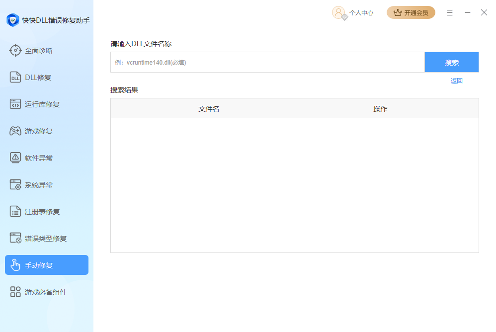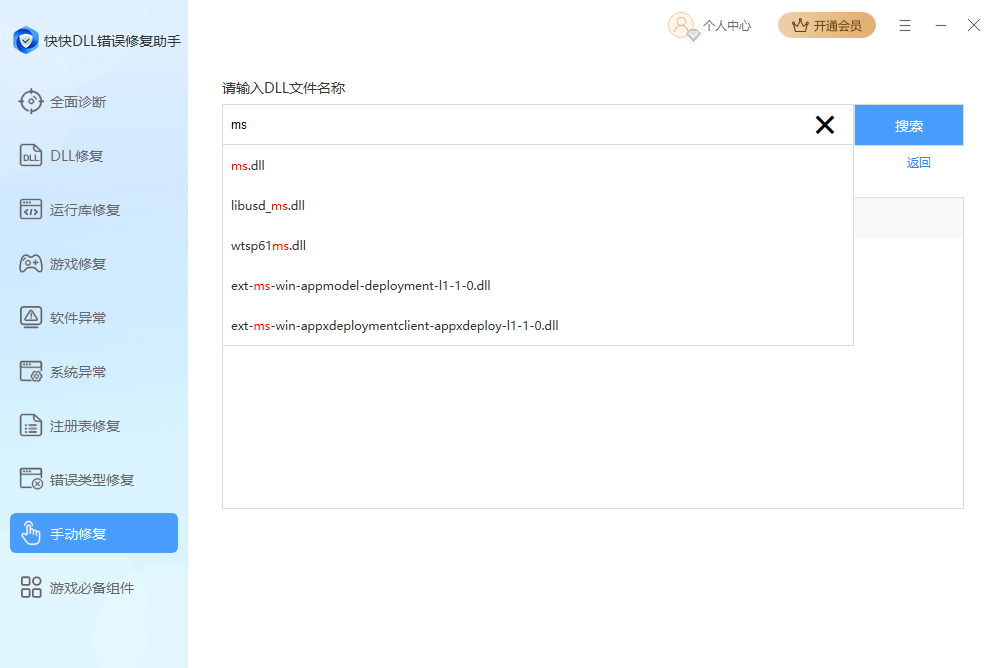 6、手动修复功能适用于部分特殊dll的修复,在输入框内输入需要的dll,在搜索结果里找到对应的项,点击右侧的详情,找到合适的版本,点击立即下载即可,下载后可选择打开文件手动进行操作,或点击立即修复,由软件将其放置合适的位置。