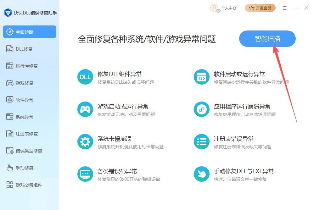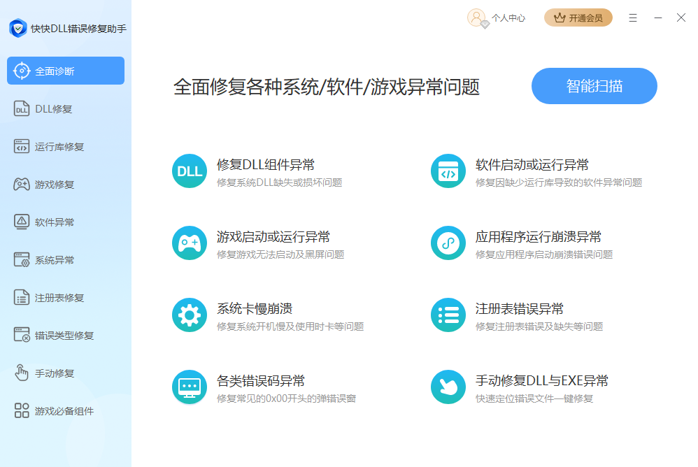 1、打开快快DLL错误修复助手,自动定位到全面诊断页面,点击智能扫描即可自动扫描电脑问题。