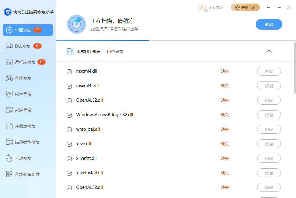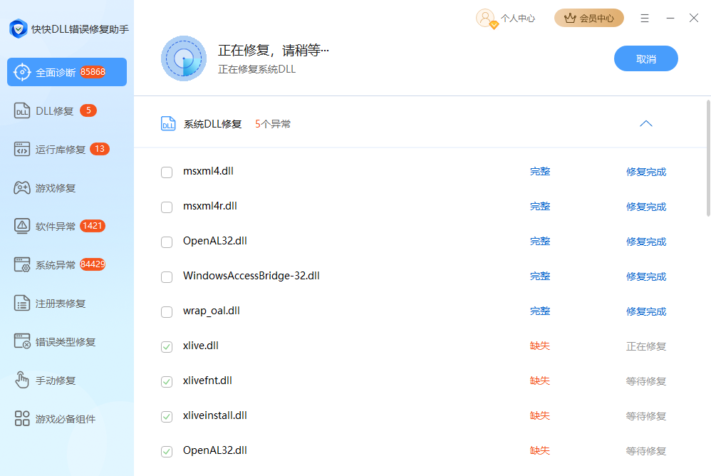 4、点击立即修复后软件即开始修复过程,如果需要取消修复,点击右上角取消按钮即可。