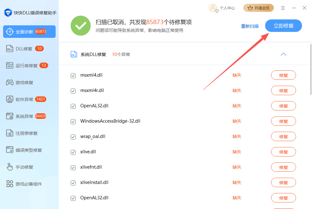 3、扫描完成后点击右上角的立即修复按钮即可一键修复所有问题,或者需要修复单项运行库的话,点击所需修复项右侧的修复按钮可以只修复一项。
