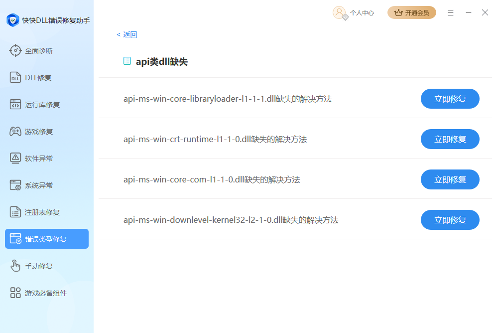 5、错误类型修复是专门用来修复特定的软件报错的功能,点击对应的错误,会有该错误提示的成因描述,点击立即修复即可自动进行修复。