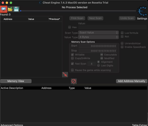 1、在本站下载安装ce修改器mac版,解压获得cheatenginexxx.app,拖动到applications文件夹安装,启动后会让你给予管理员权限,然后出现这个页面。