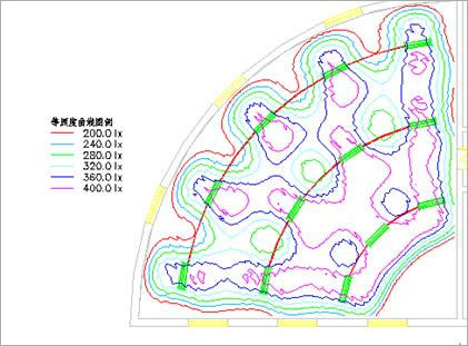 【逐点照度】可计算空间每点照度,显示计算空间最大照度、最小照度值。支持不规则区域的计算,充分考虑了光线的遮挡因素,可绘制等照度分布曲线图,输出Word计算书。