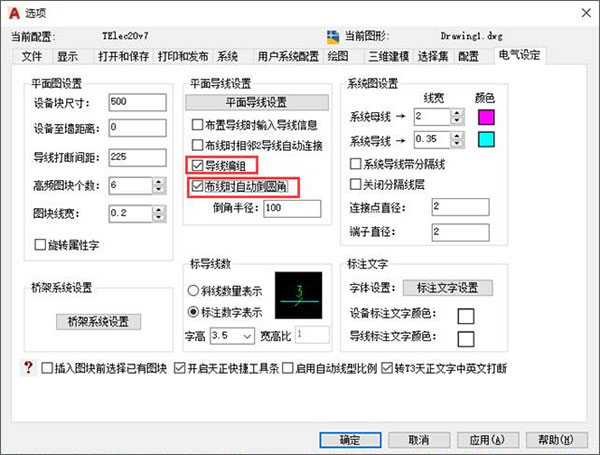 【平面布线】 根据初始设置中设置的倒角半径,绘制下一段导线时自动进行导圆角处理; 勾选导线编组后绘制导线,导线相交打断后或沿线文字标注后,其连线关系不会被断开,即:选中其中某一段导线,其余与之相连的导线也能同时被选中,仍被认为与其是同一根导线。