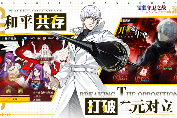 1、【原动漫 名场面】 全角色剧情在掌间完整重现,1:1 高精度 3D 建模复刻经典名场面:惊心动魄的20区突袭、震撼人心的枭战终局、惊天动地的龙战爆发。全景特效逼真还原赫子与库因克的激烈碰撞,金木研蜈蚣赫子的致命绞杀,有马贵将 IXA 光刃的凌厉锋芒,沉浸式体验东京暗黑世界的生存之战! 2、【快节奏 挖彩蛋】 从安定区静谧后巷到奎库利亚阴森地牢,从月山家奢华宅邸到流岛残酷战场,再到「V」组织戒备森严的总部。每个副本都隐藏着独特彩蛋 —— 古董店地下室的神秘线索、库因克锻造的不传之秘,等你探索。战斗节奏紧张刺激,攻守策略瞬息万变,每一步都可能是生与死的抉择! 3、【多形态 高颜值】 根据成长经历精心设计皮肤服装,白金木冷峻霸气的战斗装束、董香温婉动人的咖啡店便服、有马贵将英姿挺拔的制服、呗充满神秘感的戏服,暗黑酷飒、温柔治愈、精英飒爽、邪魅神秘等多种风格一网打尽,视觉盛宴不容错过! 4、【登录送 高倍率】 新服直接开启狂欢模式!登录即送SSS赫者,开局千抽助力,轻松组建强力阵容。无论是喰种军团还是 CCG 小队,任你自由搭配。赫子系统支持无损转换,告别废卡烦恼,随时根据战局调整策略 —— 用速度型角色制霸巷战,以范围型技能压制群体,打造专属于你的东京生存小队!觉醒守卫之战手游阵容推荐