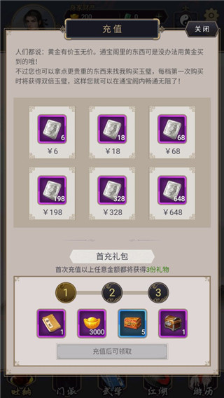 1、在江湖——丰泽坊——集市一层用黄金购买1颗大还丹或16颗小还丹,打开包裹服用,然后点击修炼至二阶以上,让功力自行运转。 2、在设置——兑换礼包处输入兑换码“a666”,领取新手礼包(相马令*100、天山融雪丹*3、黄金5000、门派献礼*5)。在设置——江湖接引使处,输入本区某位大侠的接引令,可以在邮箱处领取3000黄金。 3、依次点击门派——当值长老、江湖——百晓生居、江湖——通宝阁、江湖——庆余堂、江湖——丰泽坊获取大侠之路章节,在庆余堂中购买绿色装备寒玉带和九宫坠后装备(也可购买其他装备),前往地图——关中,直接击败boss或清空地图,找到蓝色的出口返回,此时可以集齐大侠之路前十章,获得秘笈归元心经,增加内力修炼速度53点/12秒。 4、前往北马帮拜师,在杂务堂接受任务获取贡献,贡献10以后在门派议事殿内提升门派身份至执事,并在杂务堂领取贡献更高的任务,贡献48后提升身份至亲传弟子,再次更换贡献更高的任务,之后一直等到贡献300,在藏经阁处学习相马术,然后便可离开北马帮。 5、如在酒楼遇到华服青年,借给他100黄金,收下太虚经,注意不要学习,过段时间华服青年会再次找你给你1000 黄金和太虚经,如无必要这次也不要学习,否则会多次被他揪住打一顿。 6、打开醉仙楼——门派接引看看是否有较好的门派,可以参考《江湖小数据》获取该门派的武学相关数据,这是前期前往有强力技能门派的重要途径,注意每天必看。更新日志