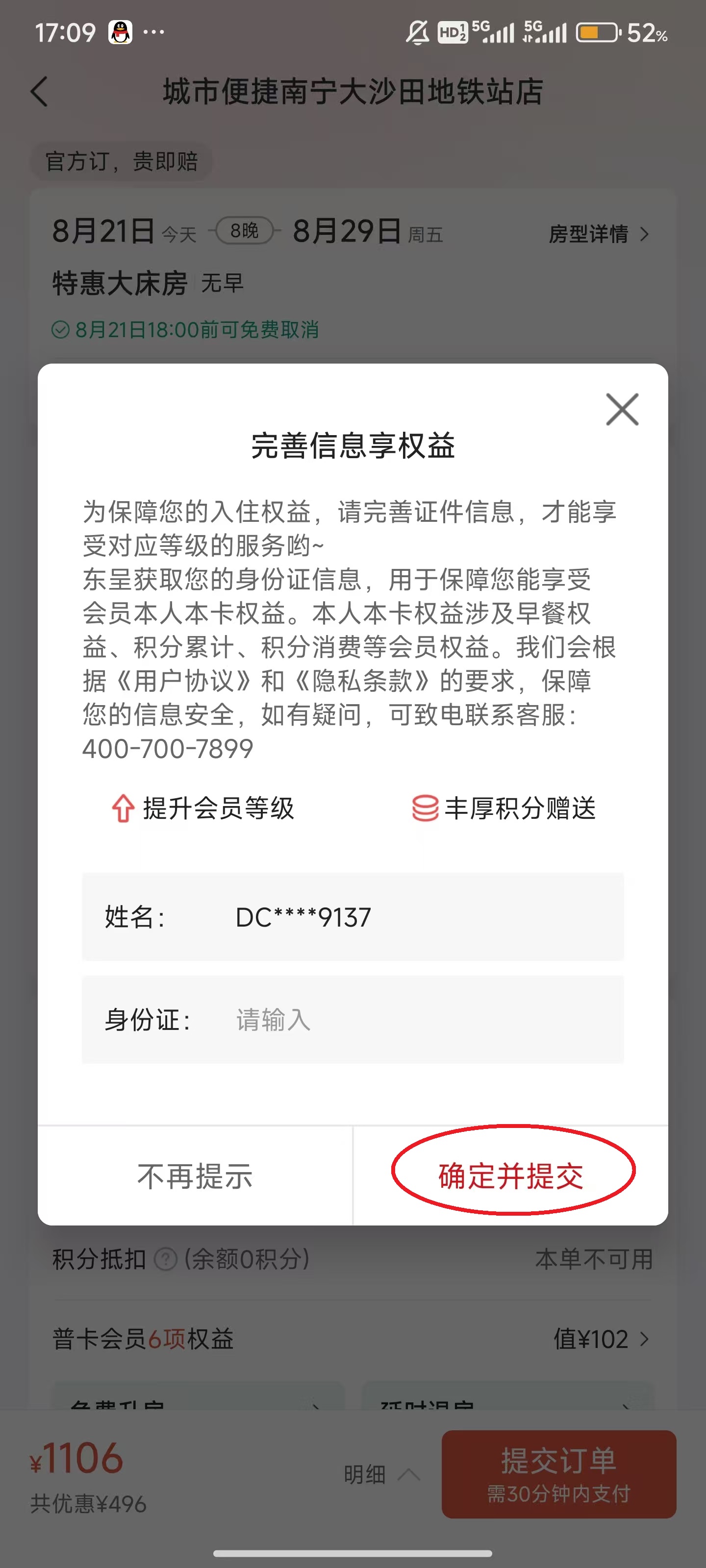 12、填写入住信息,随后点击屏幕右下角的“提交订单”。