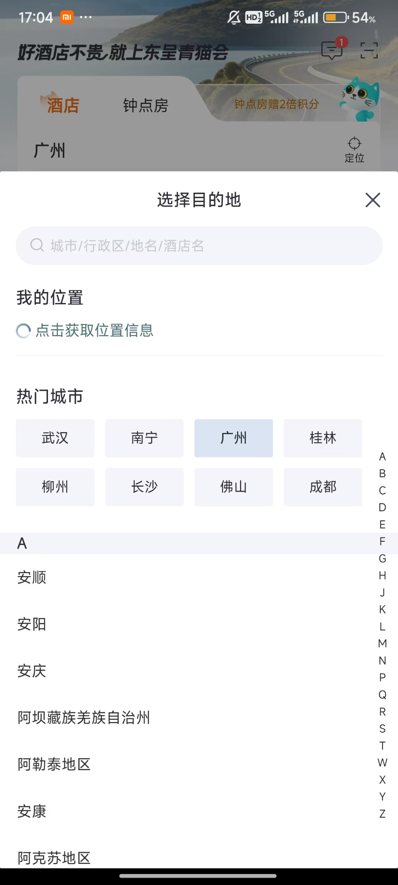 2、可以搜索城市,也可以自行根据城市首字母排序寻找。