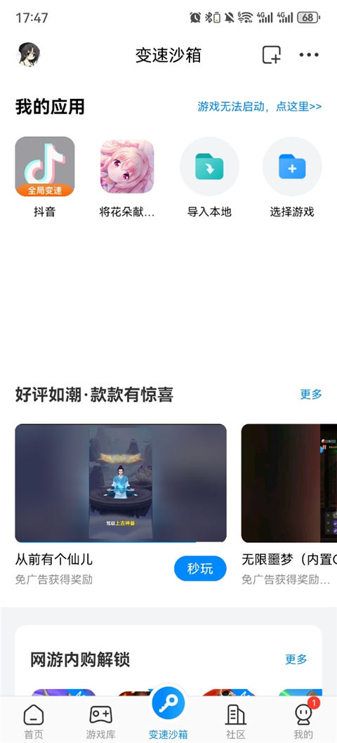 1、变速沙箱,游戏百宝箱。 2、超多平台福利,天天送不停。 3、游戏插件,拒绝重复,节省时间。 4、巨爽游戏福利,注册即领。更新日志