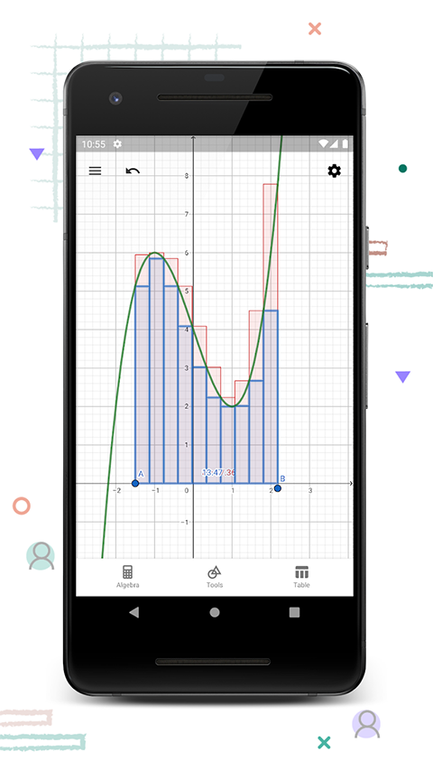 1、绘制函数曲线、极坐标曲线和参数曲线; 2、用强大的数学引擎解方程(组); 3、用滑动条体验数学变换; 4、获取函数的特殊点: 函数与x轴的交点(零值点)、最小值点、最大值点、交点; 5、查找导数和积分; 6、用最佳拟合线做回归分析; 7、直接从应用中搜索免费的学习活动; 8、保存并与朋友和老师们分享您的成果。功能介绍