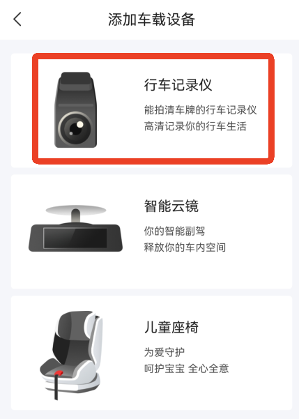 3、选择【连接设备】,选择第一个【行车记录仪】。如果你购买了其他智能车载设备也可在这个页面进行连接操作。