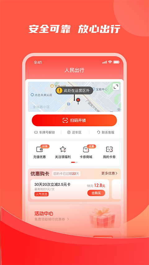 【安全可靠,放心骑行】 严格符合国家标准的车辆设计,车辆安全有保证! 【轻松省力,畅快出行】 电动助力,无需人力驱动,轻松出行! 【自由无桩,还车简单】 随停随还,无桩还车,无桩取车,取车还车都简单! 【低碳环保,助力绿色】 无污染排放,助力绿水青山,提倡绿色出行!软件优势