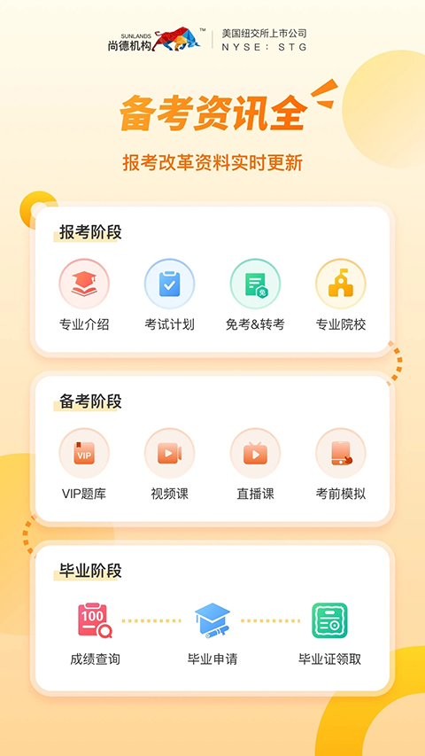 1、模式优势 采用在线直播模式进行授课,学员通过网络就可以完成全部课程的学习;这种教学方式打破了时间、地域的限制,令学员的学习更加便捷。 2、双运营模式 全面转型互联网教育模式后,打破了传统培训中老师高高在上、学生被动学习的状况;采取了老师既授课又承担运营的模式,以此增加老师和学生的即时互动,激发学员的学习兴趣和动力,并无缝答疑。 3、大数据分析 利用自身技术上的优势,沉淀学员的学习数据,并进行归纳分析,以此制定更有针对性、个性化的教学服务。 4、知识点切片 教研团队将知识点进行切片,把书本由厚变薄。每一个知识点都有对应的PPT讲义,同时再对应若干题目、视频、相应题目的讲解等,以此让考试变得不再困难。 5、产品不断迭代升级 每节课后,学员都要对老师讲课进行打分,此外,尚德机构内部也有一整套考核评价体系,以此促进教师、教案根据反馈意见做到日改进、日迭代,更好地满足学员们的需要更新日志