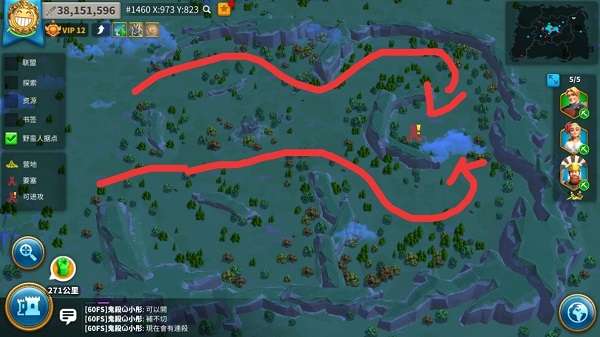 野蛮人要塞坐落于峡谷之中,有两条路可以从峡谷入口达到要塞处,这里推荐所有人一起走,大部队直接图中走上面一条路,因为上面一条路的空地较小,在密度一样的情况下敌人数量会偏小,走另一条路的野蛮人数量较多,很可能会出现没走到要塞部队已经被消耗得所剩无几了。