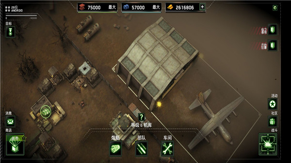 3、开始任务后,需要先设置部队部署位置,红圈内为高塔区,不能部署此处,建议观察可掠夺资源的周边建筑,计算每个障碍物的离资源点的距离,以及任务目标要求是什么,尽量完成目标以获取更多的资源,当然任务在前期都很好胜任,获得的宝箱可以开出5.56毫米机枪、MP5冲锋枪或是火炮等装备,以及等级经验,点击战队图标可查看全部武器以及设施,红色代表未获得。