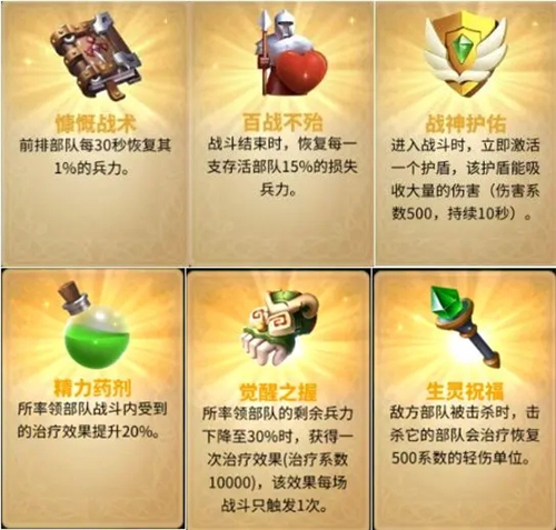 6、祝福选择技巧:最优先选【慷慨战术】+【百战不殆】+【战神护佑】等恢复类和减伤类的祝福;次要选择防御提升祝福。核心在于提高恢复能力、减少兵力消耗,这样才能走得更远。如果前几关没有选到关键祝福,也可以重新再来,虽然奖励只能拿一次,但是重来的次数不限的!另外,额外上阵一只部队的祝福也是非常实用的哟~