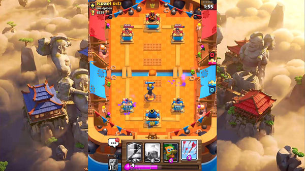 玩家可以从自己的牌库中选择8张卡牌来组成玩家自己的“出战卡组”,玩家最多可以保存五套出战卡组,然后选择一套想要出战的卡组。 在对战界面点击“对战”搜索对手,匹配系统会为玩家搜寻与玩家奖杯数相近的其他玩家,玩家拥有的卡牌数等级并不会影响对战匹配。 对战开始,被选入出战卡组中的卡牌会随机出现在卡槽中(卡槽中会同时出现四种卡牌,卡槽旁会显示下一张将出现的卡片),每位玩家初始会拥有5滴圣水(圣水随时间增长,最多储存10滴圣水),召唤不同的卡牌会消耗数量不等的圣水。 对战时,拖动卡牌,消耗圣水将卡牌召唤到阵地上进行战斗,前期只能召唤在己方阵地上,如果推掉敌人两翼的公主塔可以将召唤范围扩大。 双方阵地各有1座国王塔和2座公主塔,摧毁1个公主塔,获得1个皇冠,摧毁国王塔(主塔),获得全部3个皇冠。所有游戏模式最长持续时间为5分钟。第1、2分钟为1倍圣水,第3、4分钟2倍圣水。加时赛持续2分钟,加时赛为突然死亡模式(摧毁对方塔会直接获得对战胜利),加时赛最后1分钟将变为3倍圣水。5分钟结束后,进入决胜时刻:在对战结束时,单座皇家塔生命值最低的一方将输掉对战。部落冲突皇室战争腾讯版牌型设定