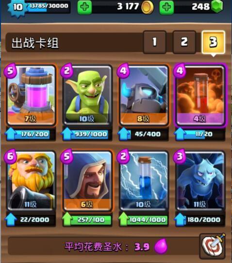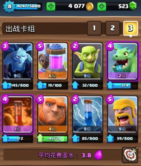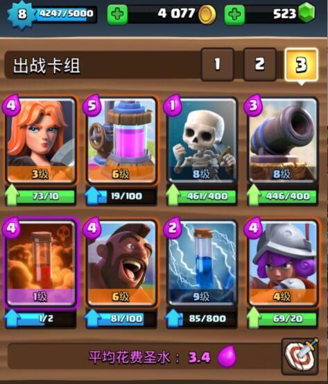 1、毒药家驹消耗流 这个卡组的主要是以消耗和一波流为主,利用皇家巨人的远距离攻击和毒药进行消耗,同时我们的法师在后方来保护皇家巨人不被一些人海卡牌骚扰,为其提供好的输出环境。这个卡组前期的时候需要先放采集器来储存和赚取费用,其他卡牌进行防守,如果敌方也出采集器的话,我们可以用毒药进行消耗。在中期的时候,我们在法师对抗了敌方的卡牌时,如果我们的费用较高,那么可以前排搭配一个皇家巨人来进行消耗,法师则用来保护皇家巨人。在后期的时候,我们在其他卡牌解除了敌方的卡时即可打出强力的反击,进行皇家巨人+毒药法术+法师+迷你皮卡的套路,在这一波中,毒药法术能很好的限制敌方的速度,同时进行消耗,皇家巨人为主要输出,迷你皮卡则是对抗敌方出现的高血量卡牌,法师则是对付人海卡,所以这一波是很强的,最后通过不断的消耗来带走对方。