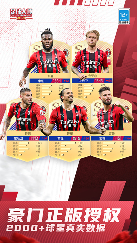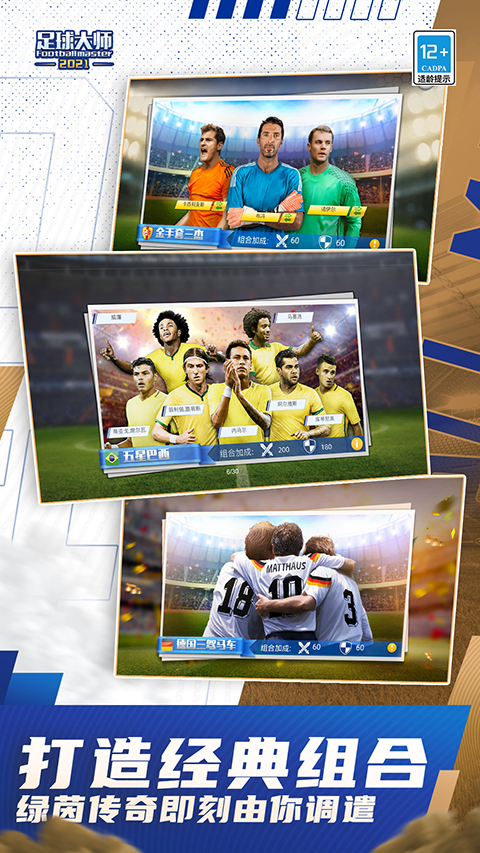 1. SL球员 --F.巴雷西、本泽马、内德维德 2. 荣誉版球员 --杰拉德、博比.穆尔、莱因克尔 3. 评级提升 --麦孔提升至CL --格纳布里提升至S+ 4. 球星之路 --新增S+球员格纳布里 5. S2年度总决赛 --赛事共12天 --报名期内经理人需要报名三支球队 --选手身份 种子选手:总决赛积分排名前100名的经理人,完成报名后直接获得晋级赛资格,您可在公告-足大总决赛查看排名 其他选手:一队阵容参加预选赛 --预选赛:参赛选手可以互相挑战,掠夺对手积分,积分排名靠前的选手可获得晋级赛资格 --晋级赛:共256位参赛选手出战,选手将分到八大赛区,与同赛区的其他选手进行小组赛、淘汰赛,决出赛区冠军。晋级赛中每支球队有出战次数的限制 --总决赛:8位赛区冠军角逐S2总冠军 --预测:晋级赛和总决赛期间,经理人可参与赛事预测 --总决赛冠军可获得S2冠军奖杯,并在奖杯上留下自己的名字!冠军可从自己的3支参赛阵容中,选择3名球员制作S2总决赛冠军系列的球员形象。球员形象将在后续版本更新上线,冠军可获赠带有自己签名的专属纪念款!游戏截图