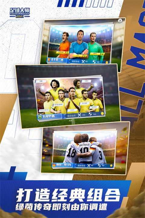 玩家扮演一名传奇球队教练,通过发掘球星、培养球员、参与世界各地联赛,一步一步打造成世界顶级球队 在游戏过程中,玩家需要招募顶级球星,遭遇豪门对手,临场战术指挥,最后问鼎十大联赛冠军,再现传奇教练的辉煌历史 玩家之间还可以互相PK,掠夺声望和资源,在联盟中组织联盟对战,在天梯赛、大师赛中争夺排名,实现自己的足球梦想 足球大师数据资源庞大,不仅有超过5000名现役球员真实能力数据,每名球员还有照片级的3D头像 除此之外,足球大师拥有接近PC游戏画质的3D渲染引擎和强大的AI动作引擎,比赛场景真实生动足球大师黄金一代常规比赛系统