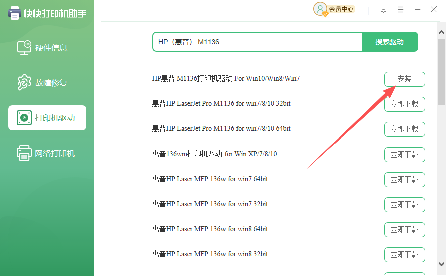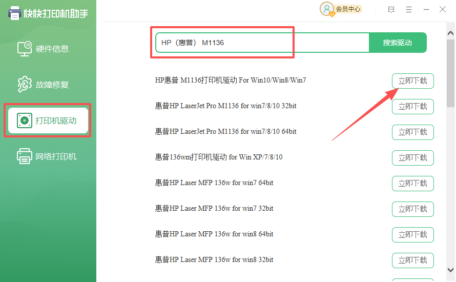 一、怎么下载惠普M1136打印机驱动? 1、点击打印机驱动,搜索惠普M1136,点击立即下载。