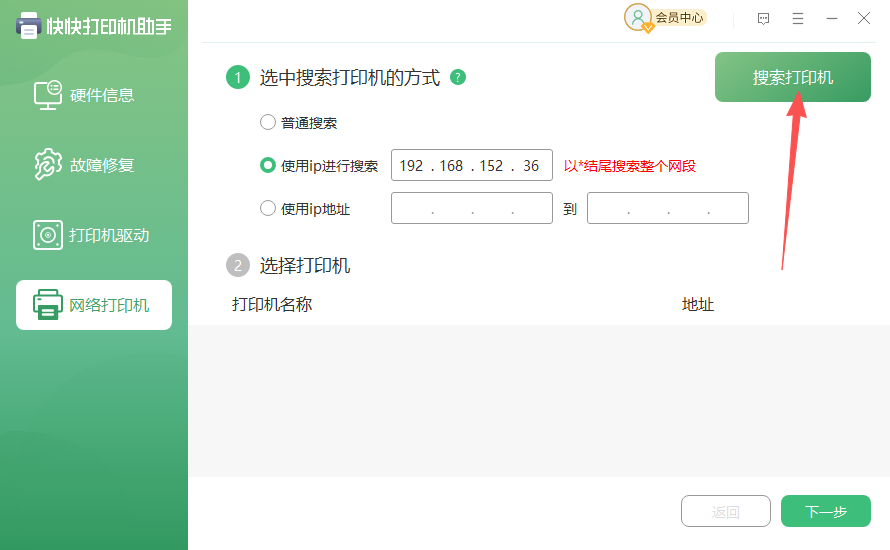 1、输入网络打印机的IP后点击右上角搜索打印机,搜索完成后点击需要的打印机连接使用。